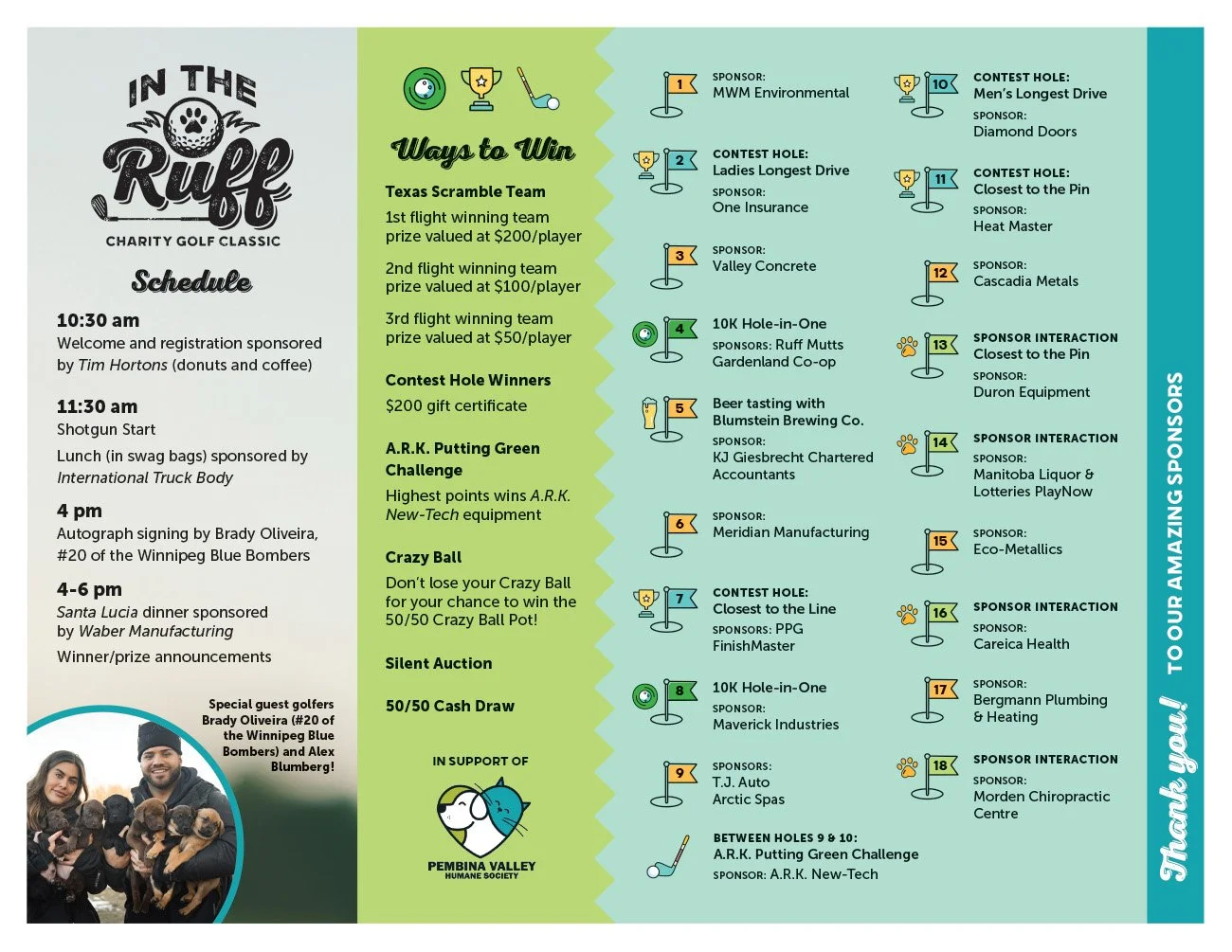 I used the Pembina Valley Humane Society brand’s colours as the palette to tie the event to the main brand. A cute dog on a green with a golf ball was a no-brainer photo choice for the event.